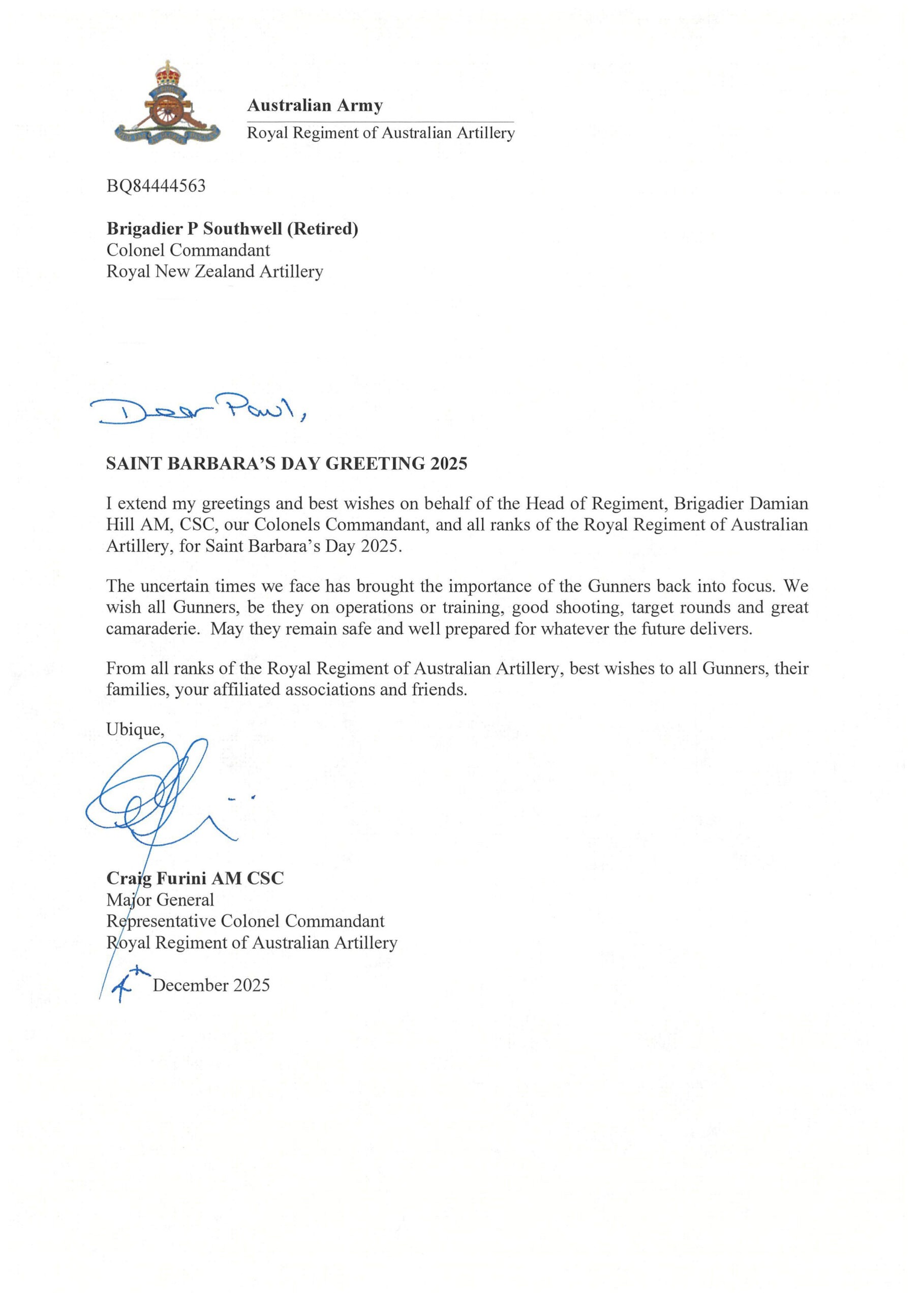 Lieutenant General M R Elviss CB MBE, extends his greetings and best wishes to all ranks, serving and retired, of the Royal Regiment of Artillery and of the Commonwealth Royal Regiments of Artillery, on